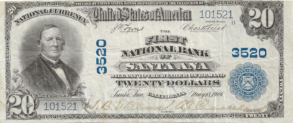 This particular note was issued by The First National Bank of Santa Ana, California, with a charter date of May 18, 1906. The obverse features a portrait of Hugh McColloch and the words "NATIONAL CURRENCY", "SECURED BY UNITED STATES BONDS DEPOSTED WITH THE TREASURER OF THE UNITED STATES OF AMERICA", "SERIES OF 1902", "THE FIRST NATIONAL BANK OF SANTA ANA WILL PAY TO THE BEARER ON DEMAND TWENTY DOLLARS" and "Santa Ana, CALIFORNIA May 18, 1906."