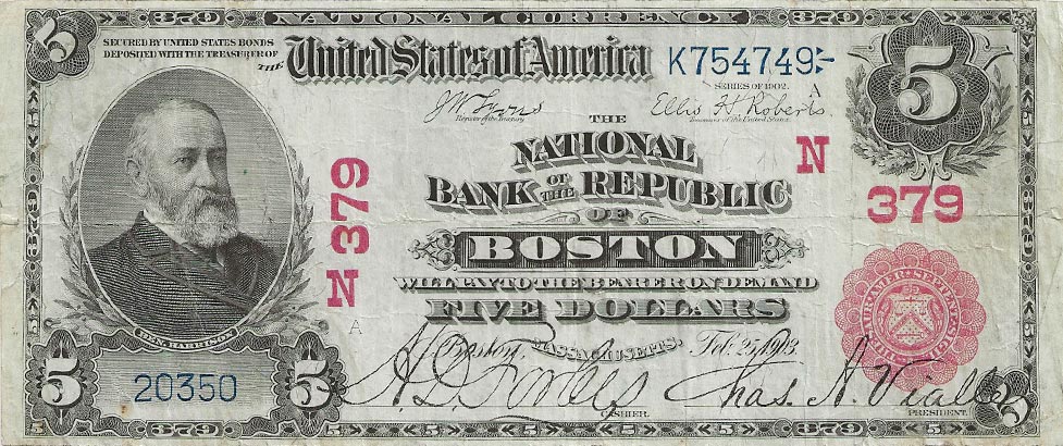 This particular note is a Federal Reserve Bank Note issued by the Federal Reserve Bank of Boston, Massachusetts. The obverse bears the legend, "NATIONAL CURRENCY SECURED BY UNITED STATES BONDS DEPOSITED WITH THE TREASURER OF THE UNITED STATES OF AMERICA OR BY LIKE DEPOSIT OF OTHER SECURITIES" and a redemption clause that reads, "REDEEMABLE IN LAWFUL MONEY OF THE UNITED STATES, AT UNITED STATES TREASURY OR AT THE BANK OF ISSUE." The obligation clause reads, "THE FEDERAL RESERVE BANK OF BOSTON MASSACHUSETTS WILL PAY TO THE BEARER ON DEMAND FIVE DOLLARS."