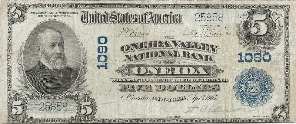 This particular note was issued by The Oneida Valley National Bank of Oneida, New York, with a charter date of April 7, 1905. The obverse features a portrait of President Benjamin Harrison and the words "NATIONAL CURRENCY", "SECURED BY UNITED STATES BONDS DEPOSTED WITH THE TREASURER OF THE UNITED STATES OF AMERICA", "Series 1902", "THE ONEIDA VALLEY NATIONAL BANK OF ONEIDA WILL PAY TO THE BEARER ON DEMAND FIVE DOLLARS" and "Oneida, NEW YORK, Apr 7, 1905".