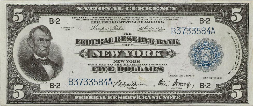 Note that, while all Series 1914 $5 Federal Reserve Notes were printed in Washington DC, they were issued for all twelve Federal Reserve districts (Boston, New York, Philadelphia, Cleveland, Richmond, Atlanta, Chicago, St. Louis, Minneapolis, Kansas City, Dallas, and San Francisco). The black seal on this particular note indicates that it was issued for the Federal Reserve Bank of New York, New York.